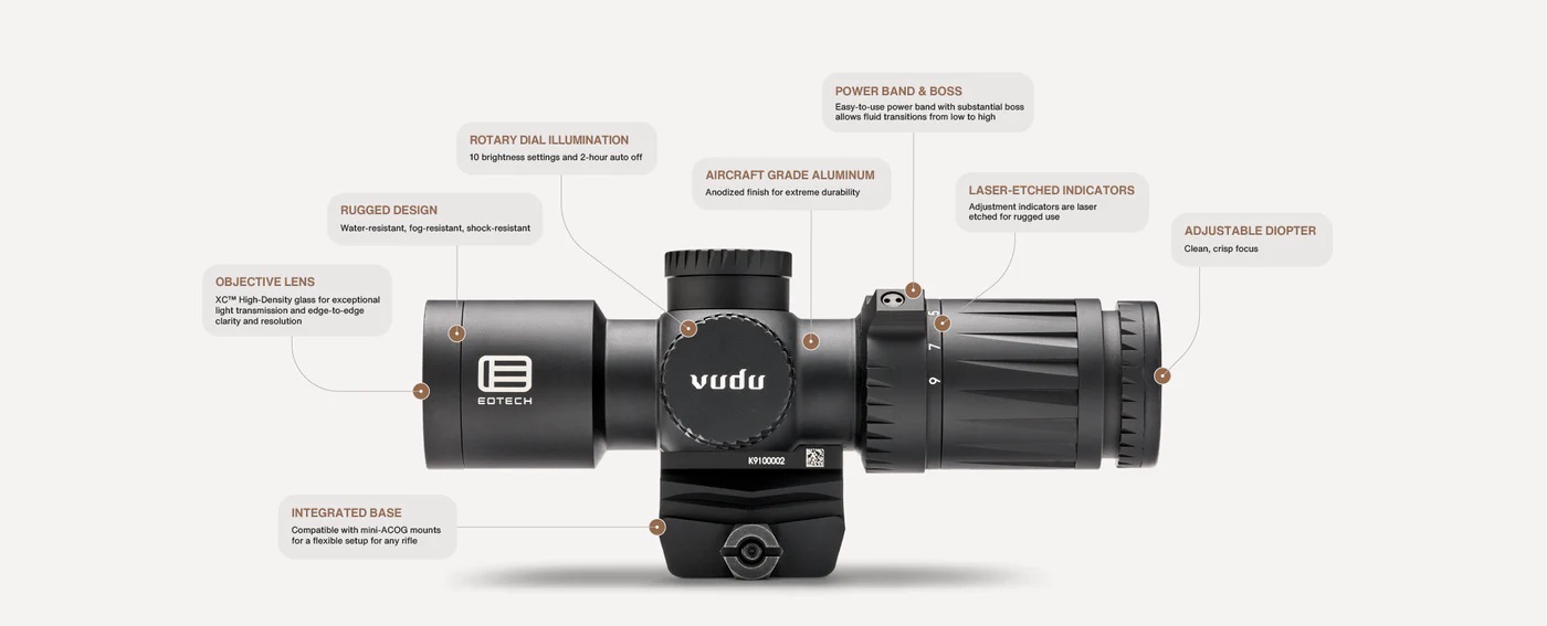 콤팩트하고 내구성이 뛰어난 Vudu® 3-9x32 는 항공기 등급 알루미늄 구조, ¼ MOA 캡형 터렛, 10단계 밝기 조절이 가능한 회전식 조명 레티클을 특징으로 합니다.